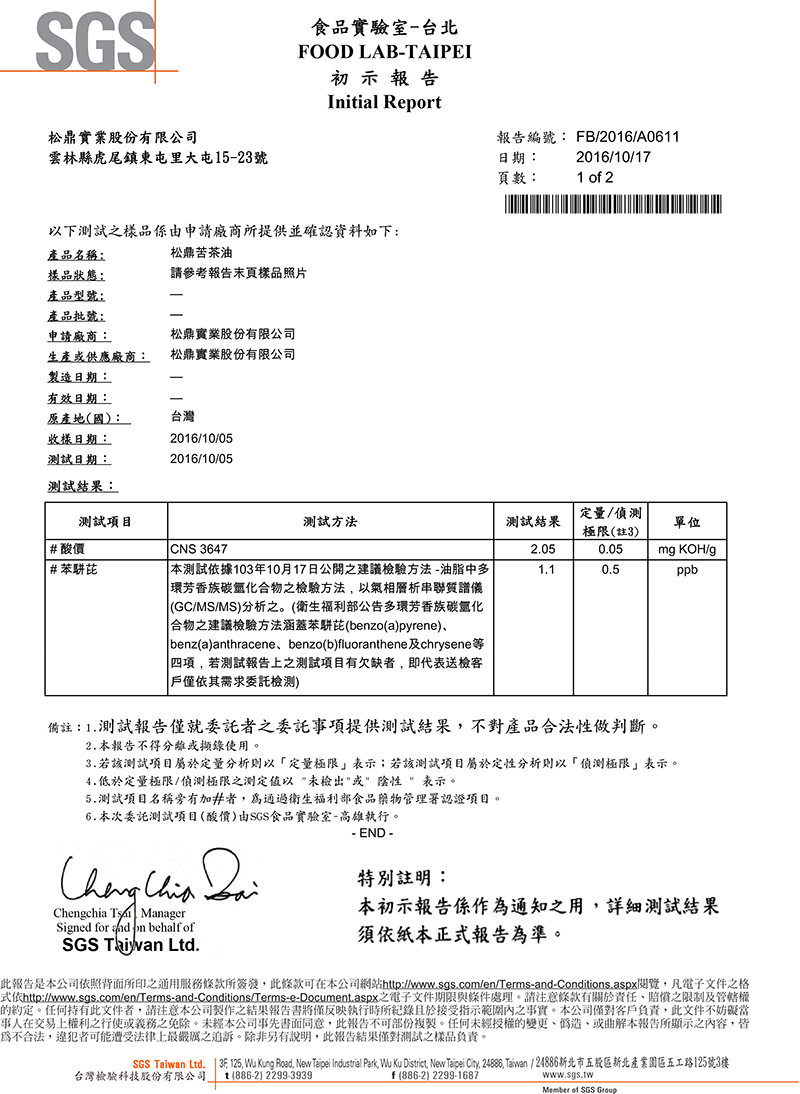 苦茶油是苦茶籽經壓榨後所得的珍貴油品, 它生長在高海拔的山坡地上, 含有豐富之蛋白質、維生素等,婦女坐月子或胃不好的人的養生食用油, 加熱時不易產生油煙, 相當的穩定油品。